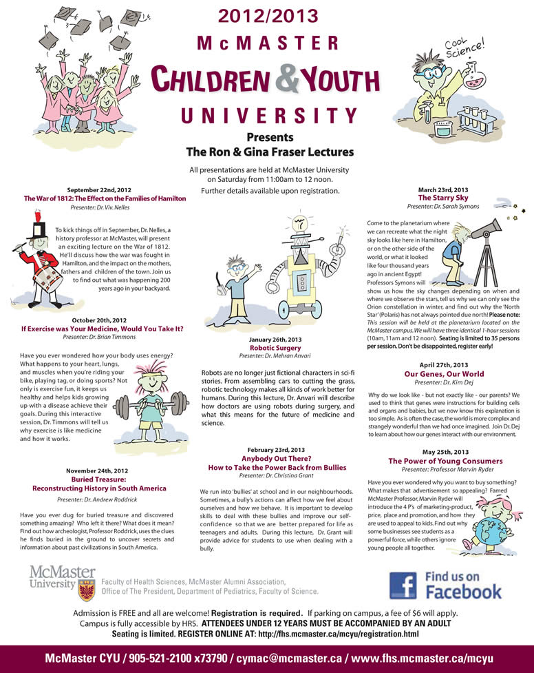 McMaster Children and Youth University. MCYU offers free, monthly Saturday morning lectures for young students (7-14 years old), to spark their curiosity and expose them to the university environment. I will be presenting on April 27th, 2013.